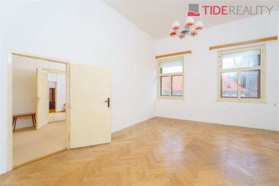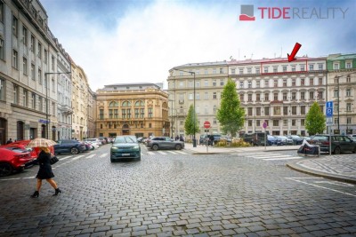 Unique investment opportunity! Exclusively on behalf of the owner, we offer for sale a very spacious, bright, and above all, quiet apartment located in the absolute center of Prague 1, on the 6th floor, i.e., the last inhabited floor (not attic!) of a beautifully renovated Art Nouveau building on Senovážné Square, directly opposite the Jindřišská Tower. This apartment with tremendous potential spreads over a total area of 91 m2 and offers a great variability for future rearrangement. The dividing walls between rooms are not load-bearing, some not even bricked, and the layout of rooms and new arrangement can be altered according to the individual requirements of the new owner. All 4 rooms (15m2, 15m2, 20m2, 28m2) have a ceiling height of about 4m (possible to install a gallery), southern exposure, and all offer a unique and unobstructed view of the Jindřišská Tower. The apartment is heated by an air-to-air heat pump with 4 split units in each living room, hot water is provided through a karma system, and gas is also installed in the kitchen. Original parquet floors in all rooms, wooden casement windows.