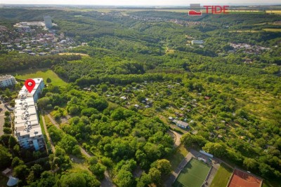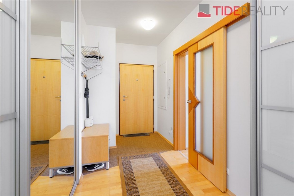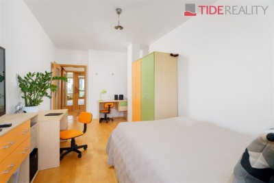 This spacious 4+kk apartment is located on the 4th floor (penultimate floor) of a building adjacent to the extensive Divoká Šárka forest park. It has a floor area of 115.4 m², a practical balcony size of 10m², a storage room in the basement (6m²), and one garage parking spot. There are reserved outdoor parking spots for residents near the building.