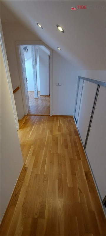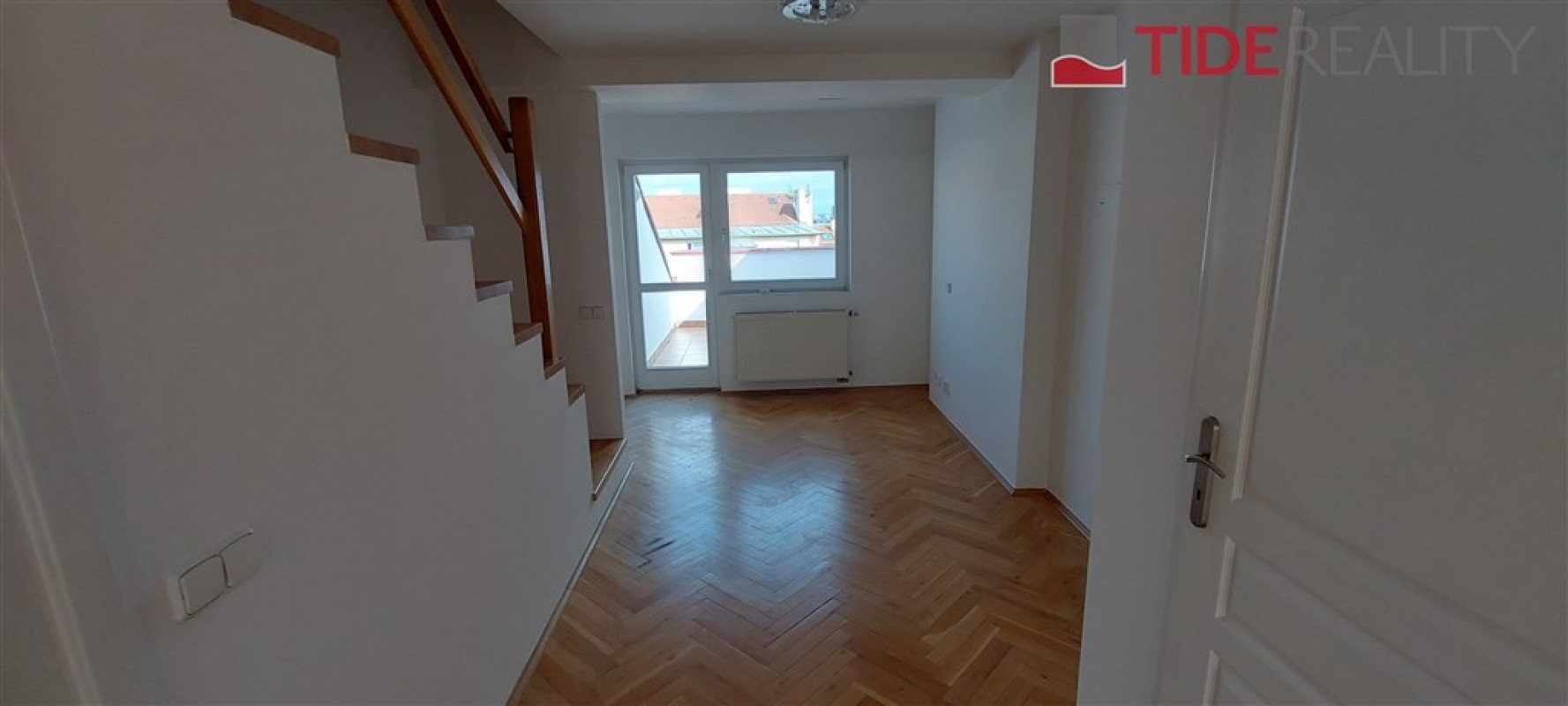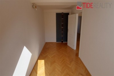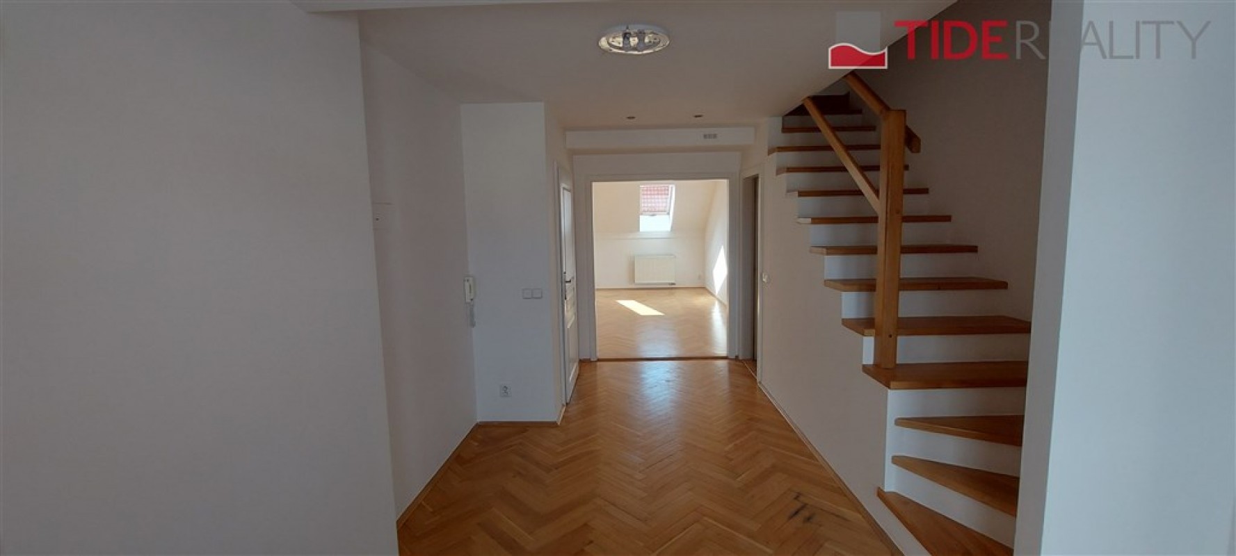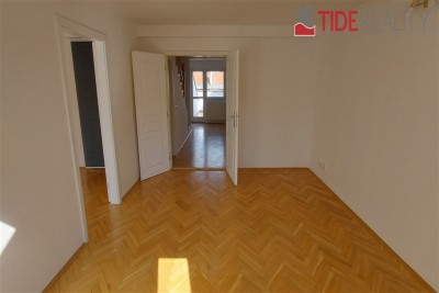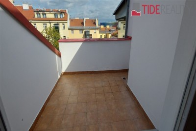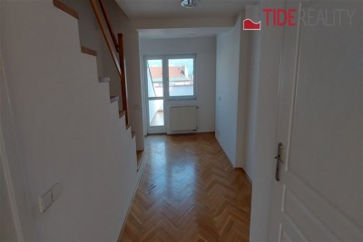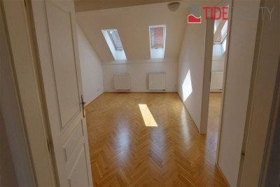 Byt se nachází ve 4. (nejvyšším) patře s výtahem a je ve dvou úrovních. Podlahy jsou dřevěné, bezpečnostní dveře, ústřední topení. V první úrovni se nachází velký otevřený obývací pokoj s dvojitými dveřmi a 1.ložnice, hlavní koupelna s vanou a WC , plně vybavená kuchyně, jídelní prostor a terasa ze které je výhled na střechy okolních domů. V horní úrovní je 2.ložnice, předsíň a WC. Volné od 1.8.2025