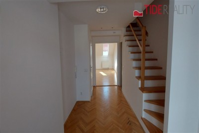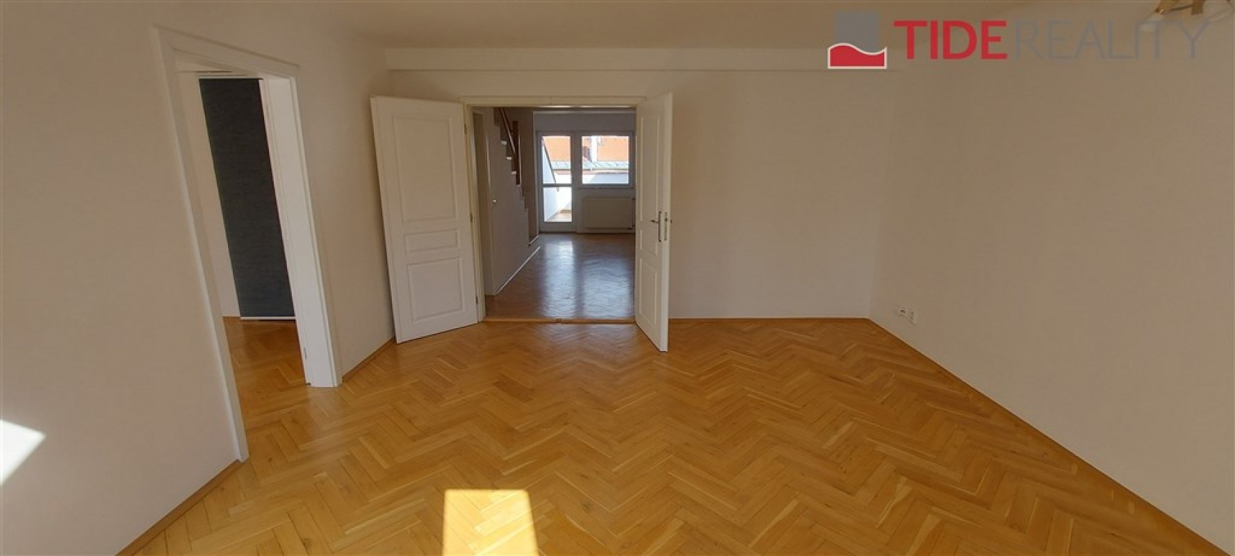 Zrekonstruovaný, nezařízený mezonetový byt 3 + 1 o celkové ploše 120m² ve Slovinské ulici, na okraji Vinohrad a Vršovic. Krásná stará budova, s novou fasádou. Autobusová zastávka je na nedaleké Kodaňské ul., tramvajová zastávka pak cca 5 min pěšky na ulici Moskevská kde je spousta obchodů, potraviny, restaurace s venkovními terasami, parkování na ulici. Vršovice jsou skvělou rezidenční čtvrtí.
