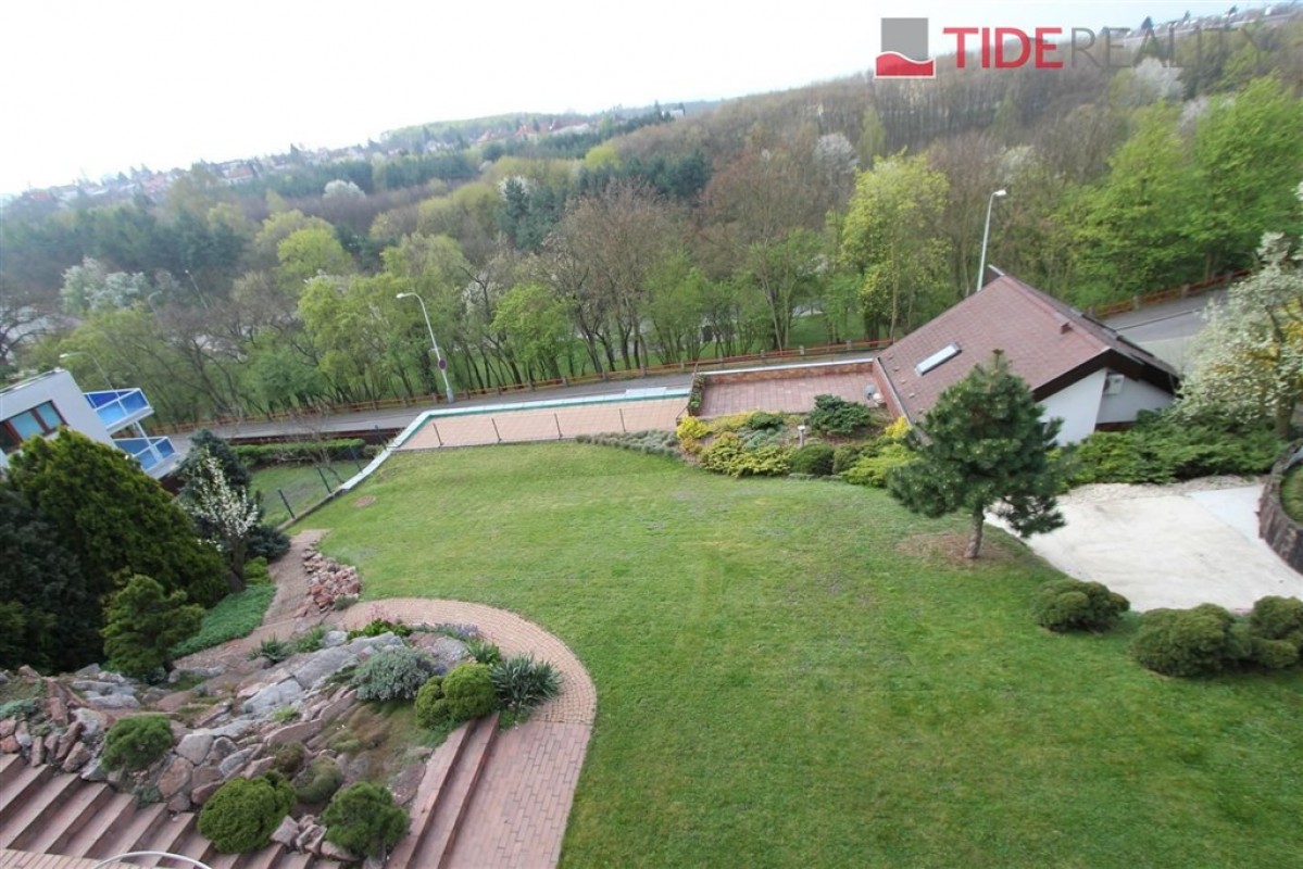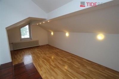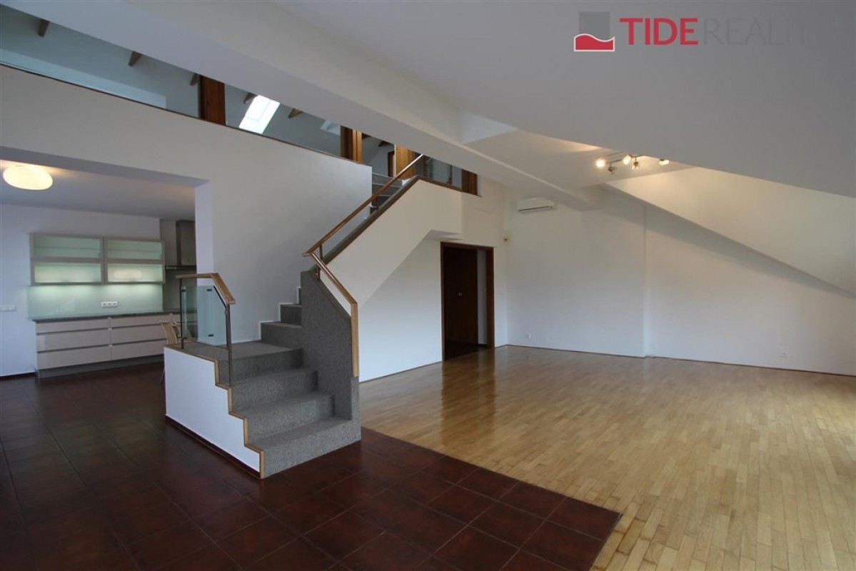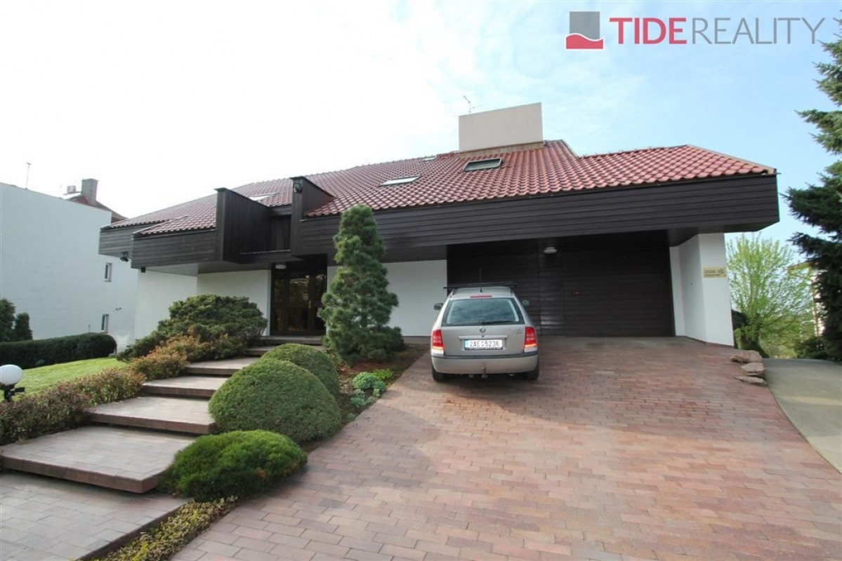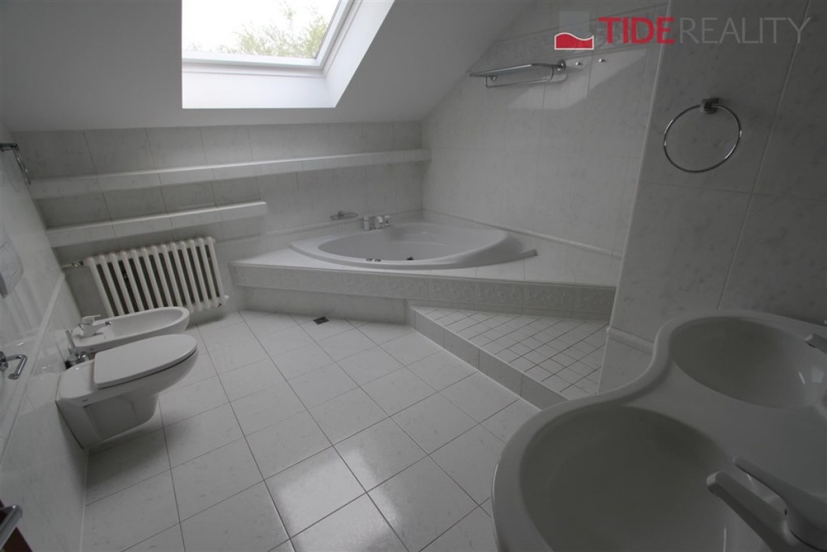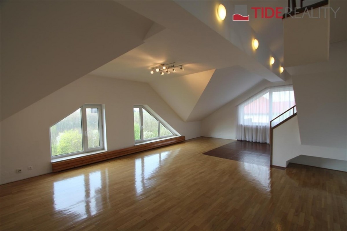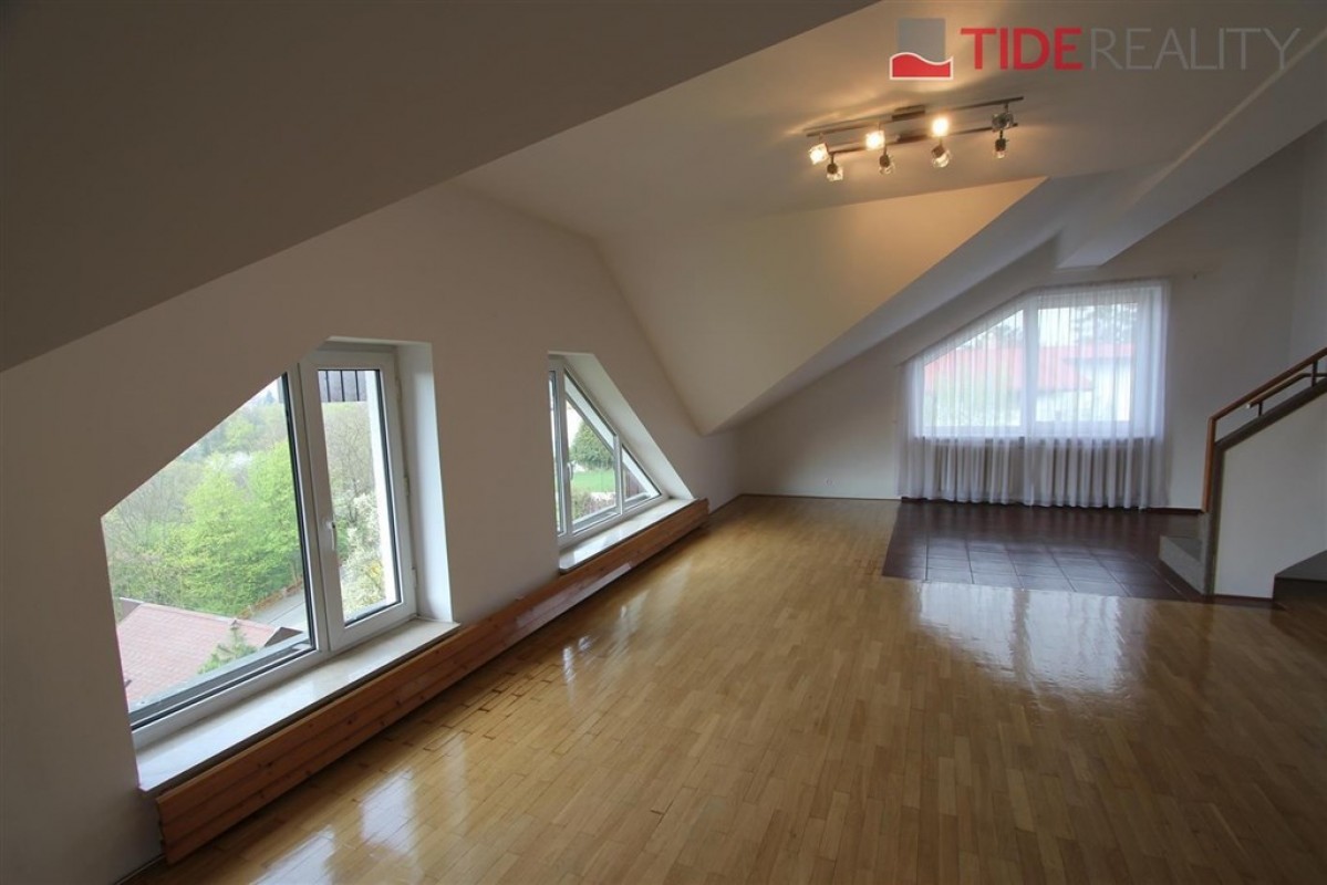 Prostorný mezonetový byt ve vile o celkové rozloze 290 m2 je situovaný v 1.patře a podkroví. V prvním patře se nachází 4 ložnice, obývací pokoj 50 m2, nadstandardní plně vybavená kuchyně, 2 koupelny, šatna, vestavěné skříně. Balkon s velmi pěkným výhledem. Na podlahách jsou parkety, dlažba a plovoucí podlahy. Ve druhém patře je potom galerie 36 m2 a další ložnice ( eventuelně herna, či pracovna). Na podlaze je v tomto podlaží koberec. Součástí nájmu je garáž a možnost užívání zahrady. PENB C. Volný ihned. Dům se nachází v klidné vilové zástavbě. Nájemné 55.000, Kč / měsíc + 12.000 zálohy na služby a energie.